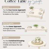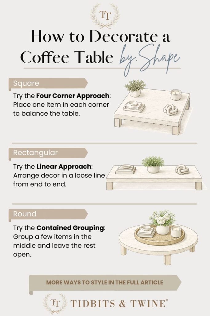 Before diving into the layouts, think about the shape of your coffee table. What looks great on a long rectangle might not feel right on a round or square one. Once you know your shape, it’s easier to pick the layout that fits best.