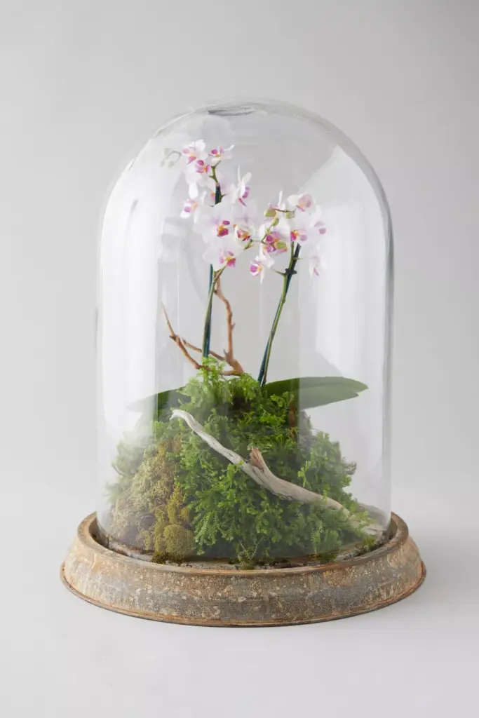 Perfect for housing a small fern or moss arrangement, this terrarium’s softly dimpled glass and brass finish bring an elegant, timeworn touch to any tabletop or windowsill.