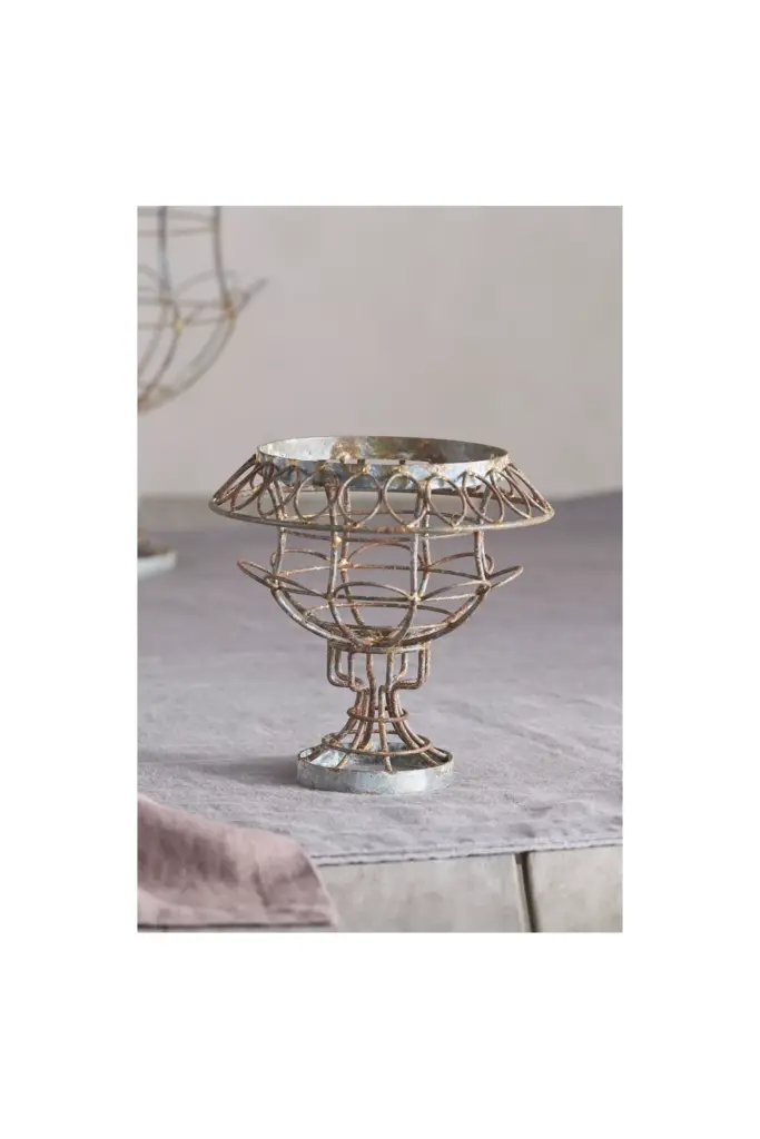 A graceful iron pedestal with a weathered finish that adds height and vintage charm to any garden display.