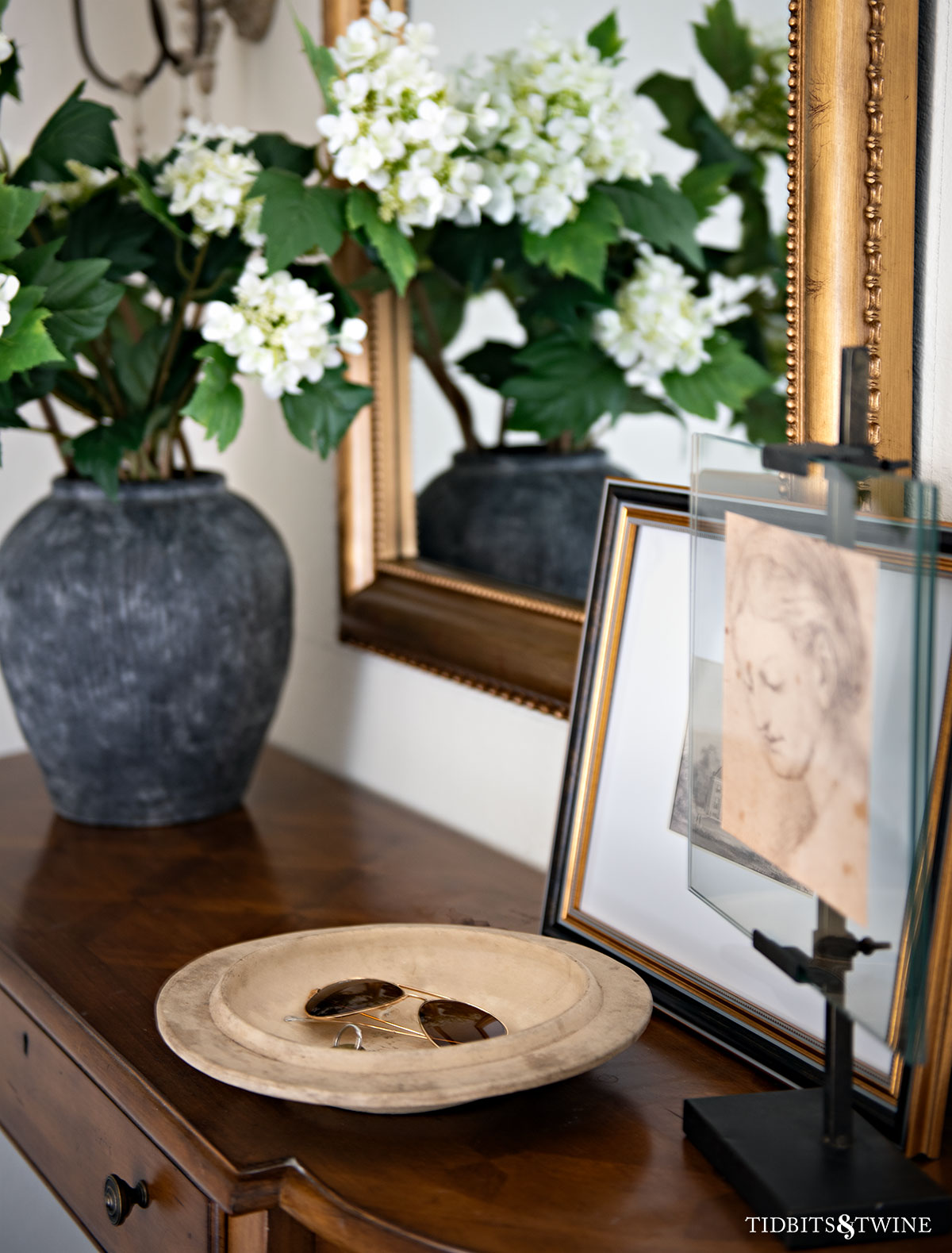 Most entryway consoles need a place to drop keys, mail, or sunglasses. A bowl or tray keeps those items contained so they don’t take over the surface.