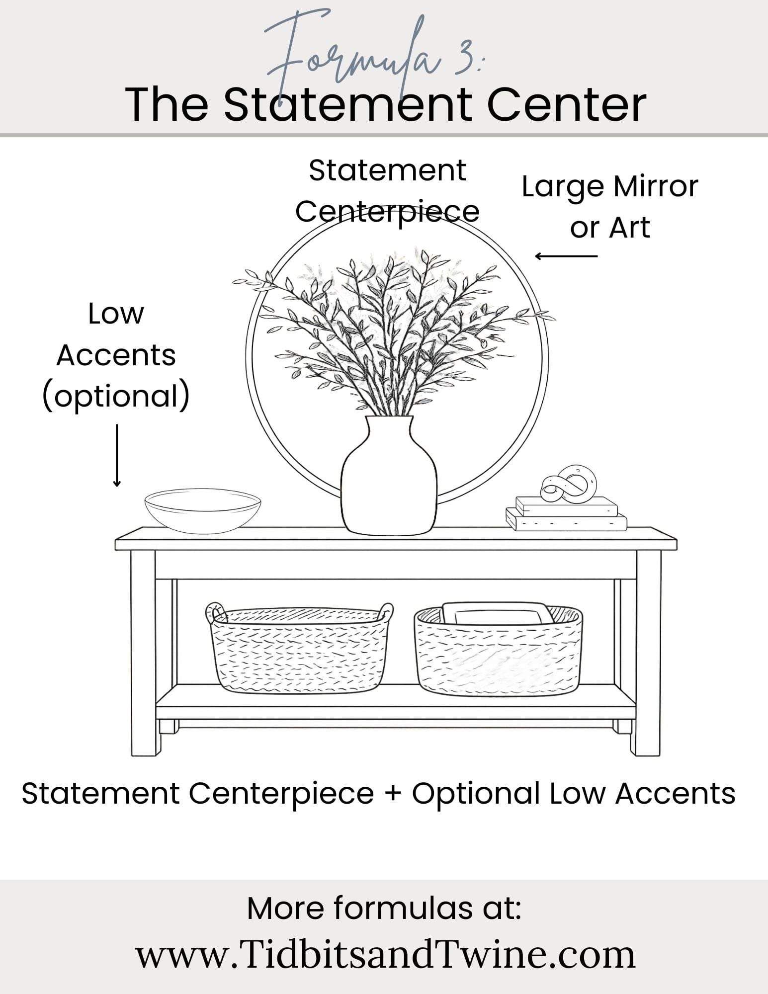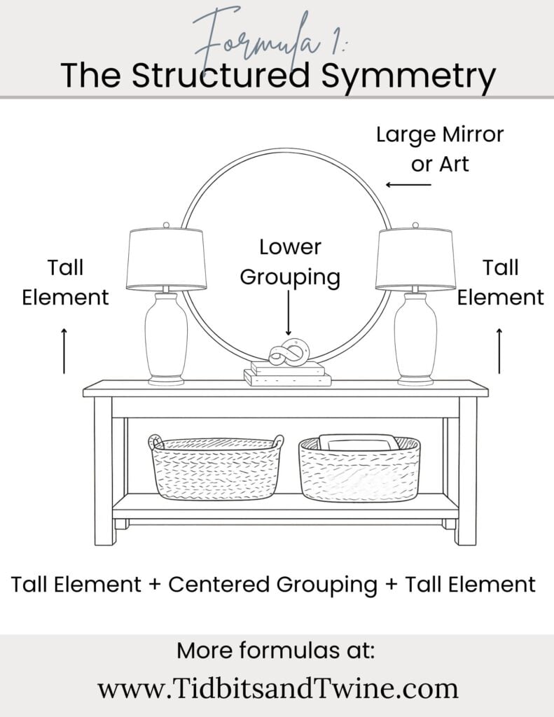 Make sure your console is long enough to comfortably support two taller elements without crowding the center. Around 60 inches or longer works well.