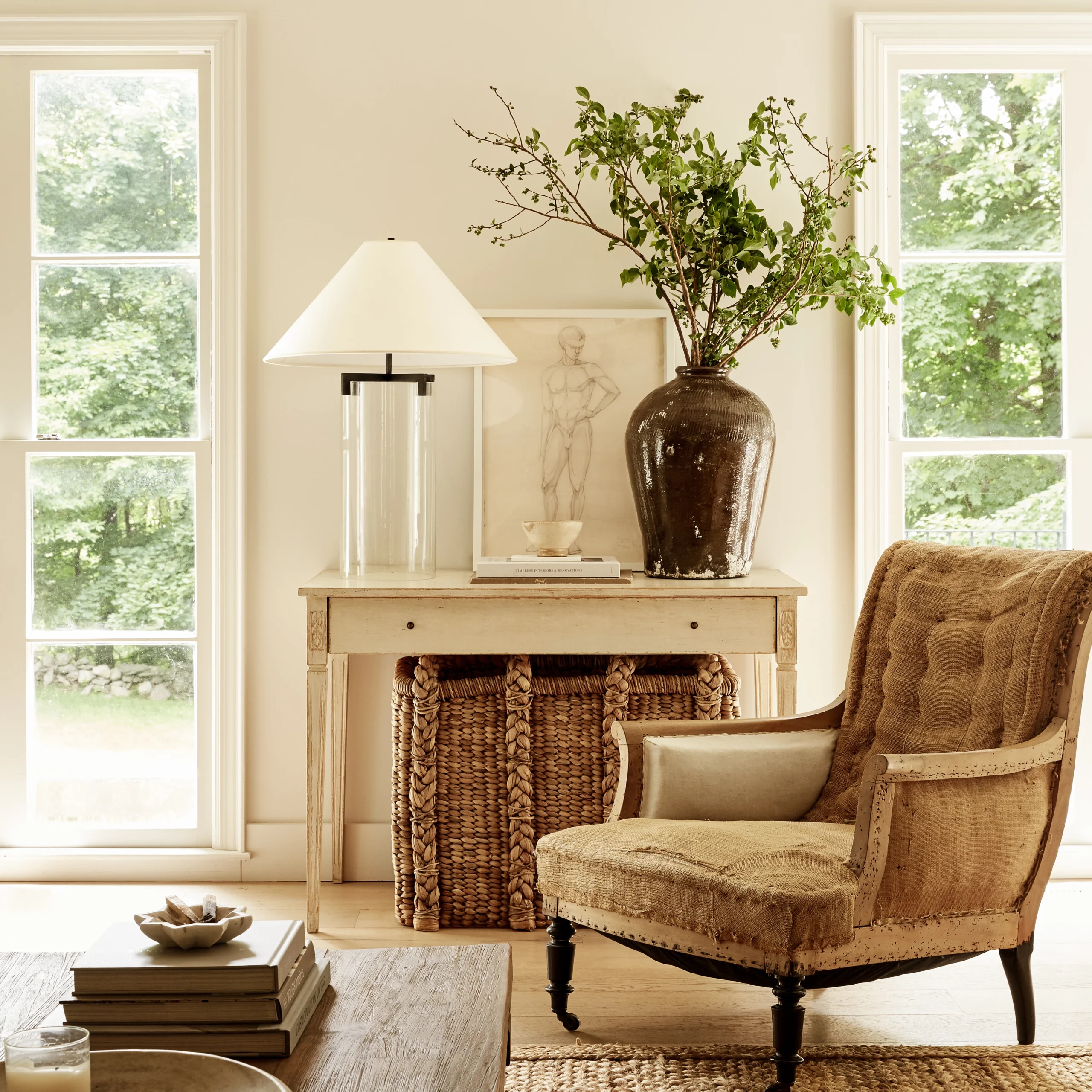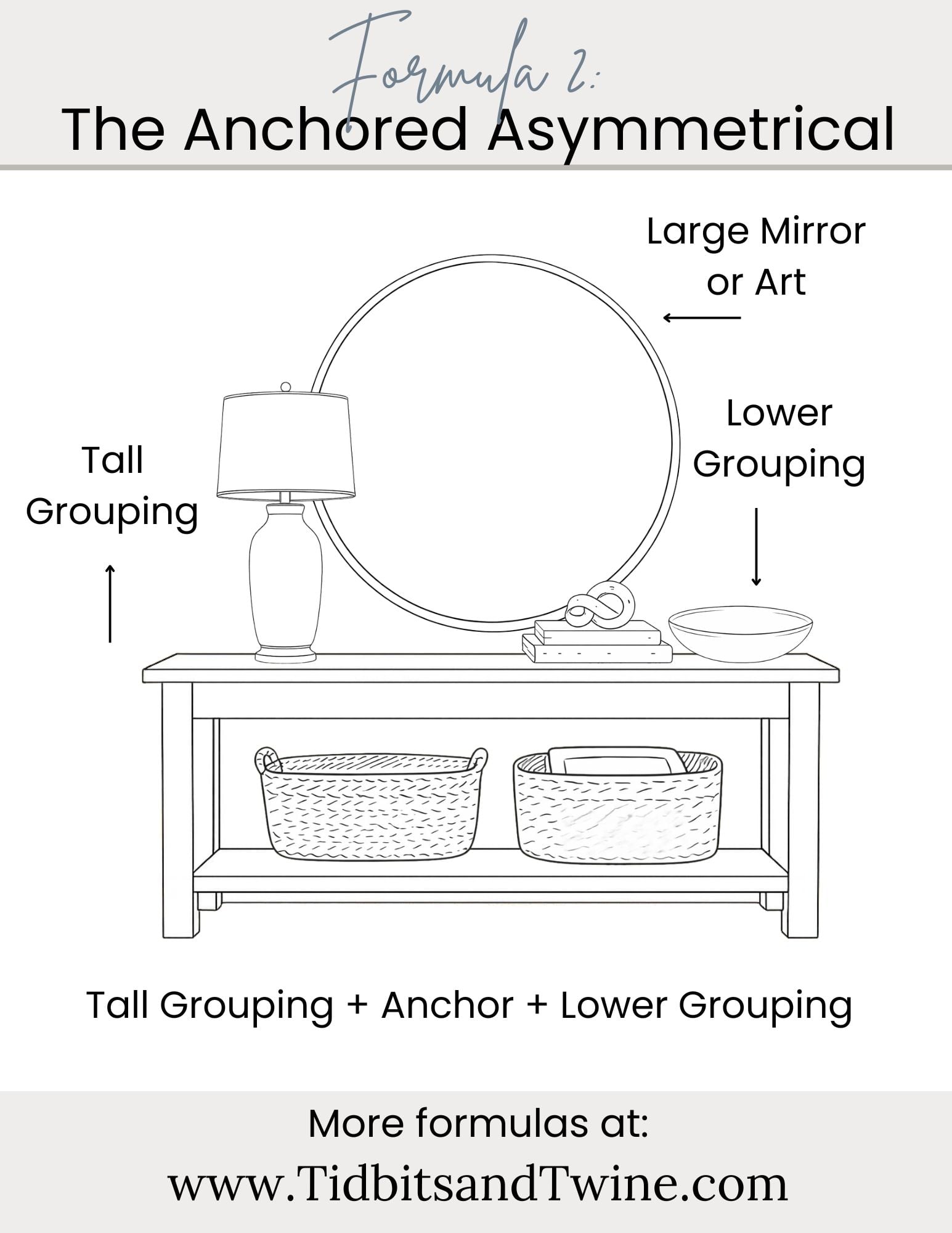 Let the taller grouping sit slightly off to one side, not pushed all the way to the edge. That grouping can be a lamp or a vase with branches. If you use greenery, that already satisfies the organic element.