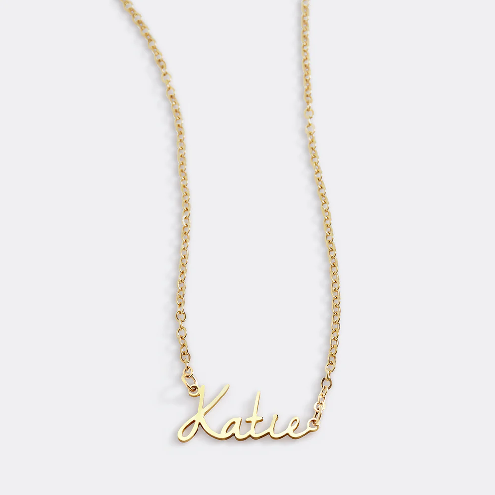 A delicate gold name necklace with a whimsical font that feels personal and fun.