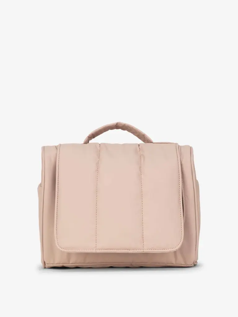 A cute, travel-ready toiletry bag that zips up neatly and hangs in bathrooms, closets or suitcases — ideal for packing makeup, skincare, or hair tools.