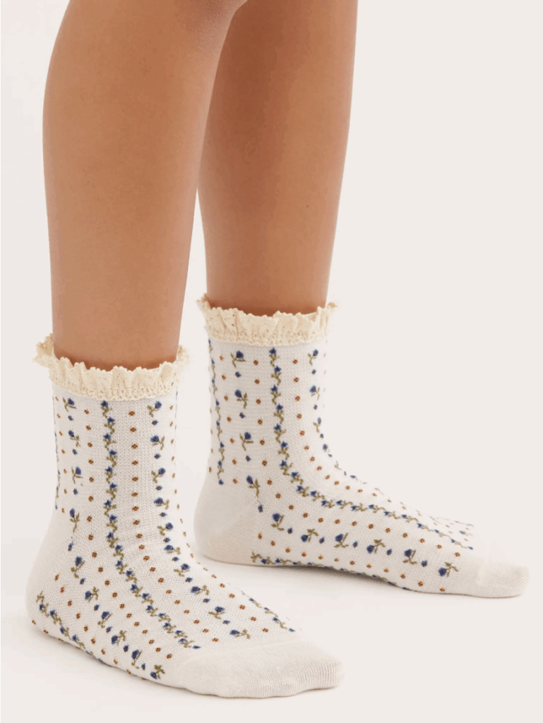 A fun addition to your look, these waffle knit ankle socks feature a patterned, embroidered design with crochet lace at the ankle.