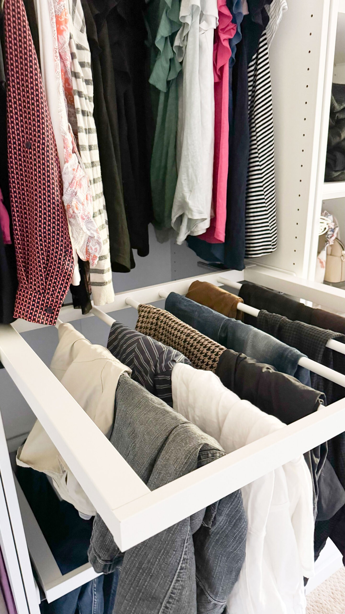 I was so excited about the pull-out pant hanger. They felt smart. Organized. Like a grown-up closet decision. In reality? They’re a complete waste.