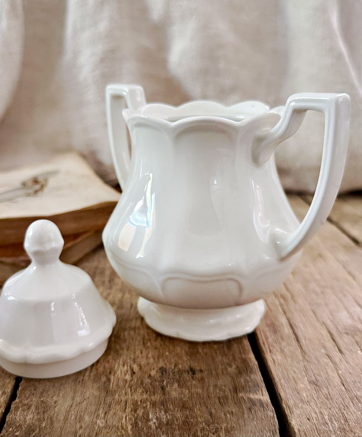 This elegant vintage covered sugar bowl was made by J&G Meakin of Staffordshire, England as part of their Heirloom Ironstone collection. Featuring a graceful paneled body, scalloped rim, double handles, and a domed lid with finial, it embodies the timeless charm of classic English ironstone.