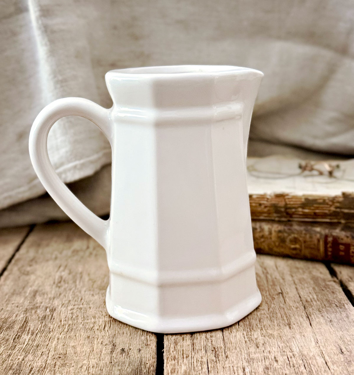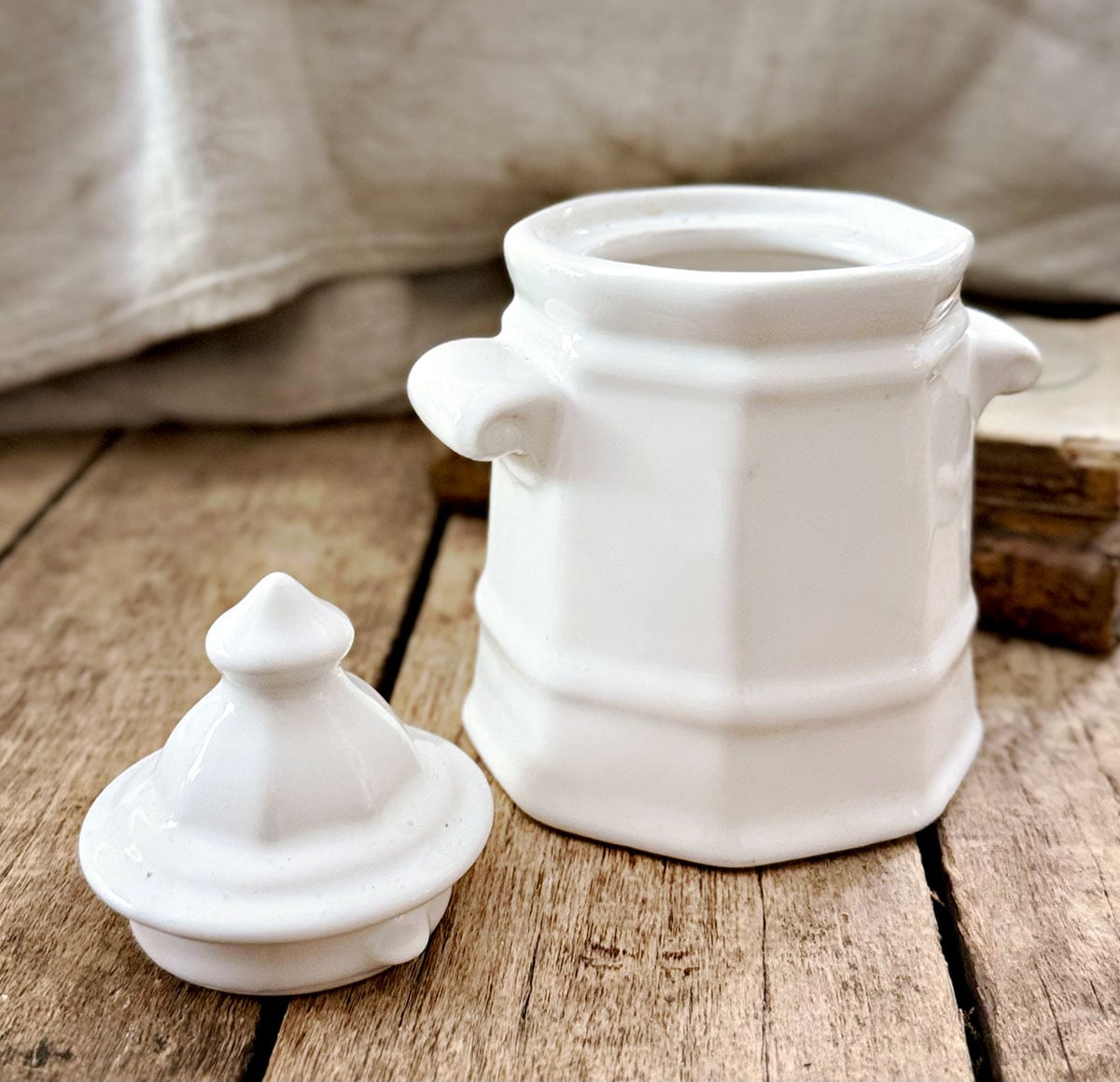 A charming two-piece white ironstone set featuring a lidded sugar jar and matching creamer. Both pieces have crisp octagonal/paneled sides, stepped banding, and a bright white glaze—easy to style on open shelving and perfect for farmhouse, cottage, or traditional kitchens. Petite, architectural, and wonderfully simple.