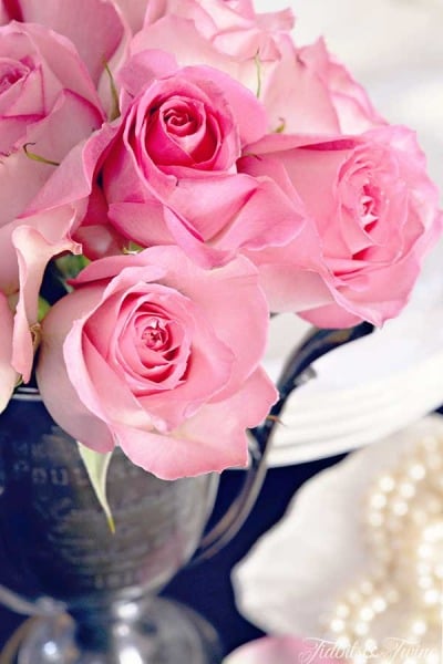And now on to the dining room. I put together a simple brunch tablescape using roses, hydrangea, basil, and pears. Natural elements are my favorite tabletop decor items.